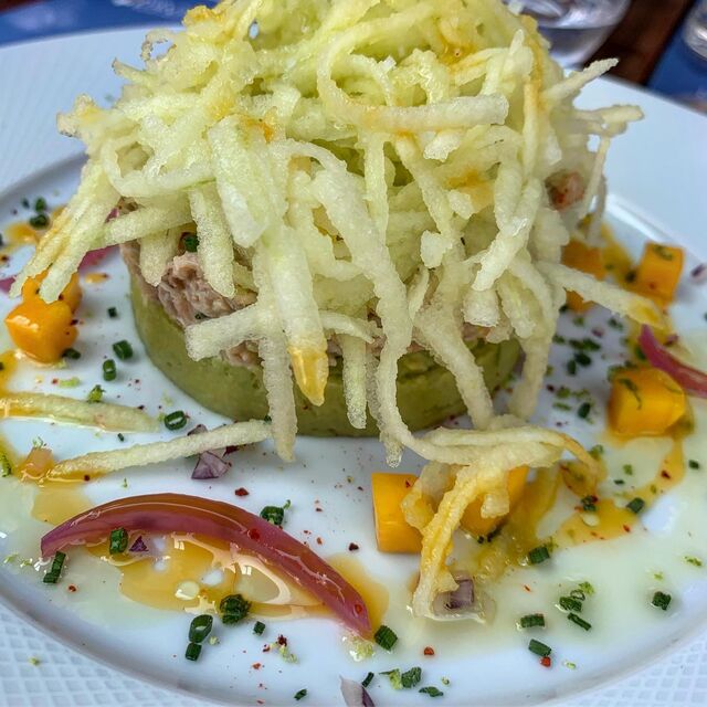 Tourteau de crabe en vinaigrette exotique, accompagné de son guacamole épicé, cébette, mangue et sa Granny Smith